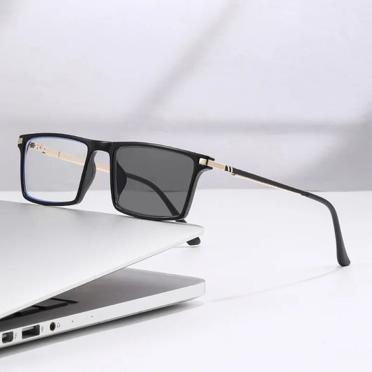 Unisex Lesebrille mit wechselnden, dunkleren Gläsern im Sonnenlicht. 0-4,00